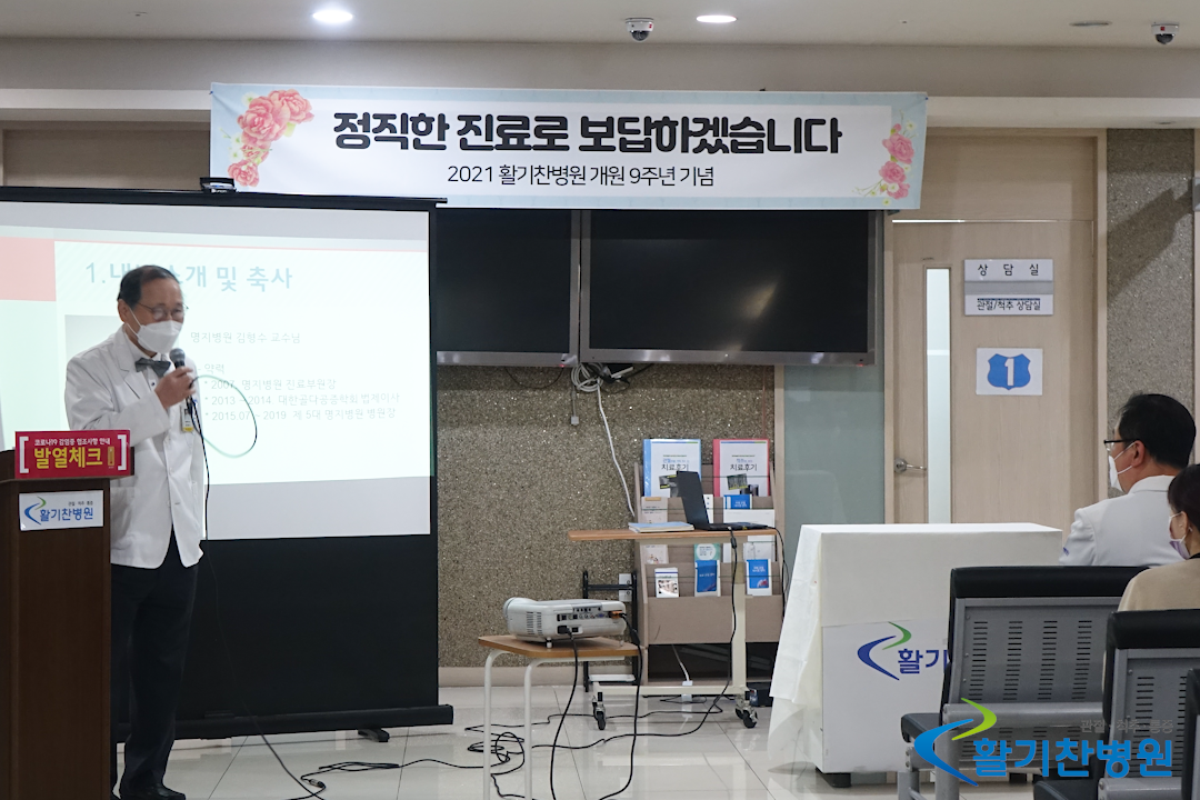 제일 먼저 이른 아침에도 활기찬병원의 9주년을 축하해 주시기 위해 명지병원 김형수 교수님이 참석하셔서 축하의 말씀을 해주셨습니다.