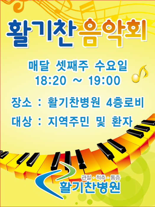 활기찬병원에서는 입원환자 및 내원환자, 지역주민들을 대상으로 매월 세째 수요일 저녁마다 작은 음악회를 열기로 하였습니다. 프로급 연주자들의 연주는 아니지만, 쉽게 접할 수 없는 바이올린 및 섹소폰 연주와 프로를 지망하는 가수들의 노래도 들으실 수 있게되었습니다. 아픈 몸을 치유하는 것도 병원의 역할이지만, 메마른 영혼에 감미로운 음악으로 삶의 여유와 마음의 병까지 치료하는 것도 저희 활기찬 병원의 몫인 것 같습니다. 첫 번째 음악회는 오는 10월 24일, 18:20 예정이오며, 장소는 활기찬병원 4층 진료대기실 입니다. 지역주민 및 내원 고객분들의 많은 참여 바랍니다. 감사합니다.