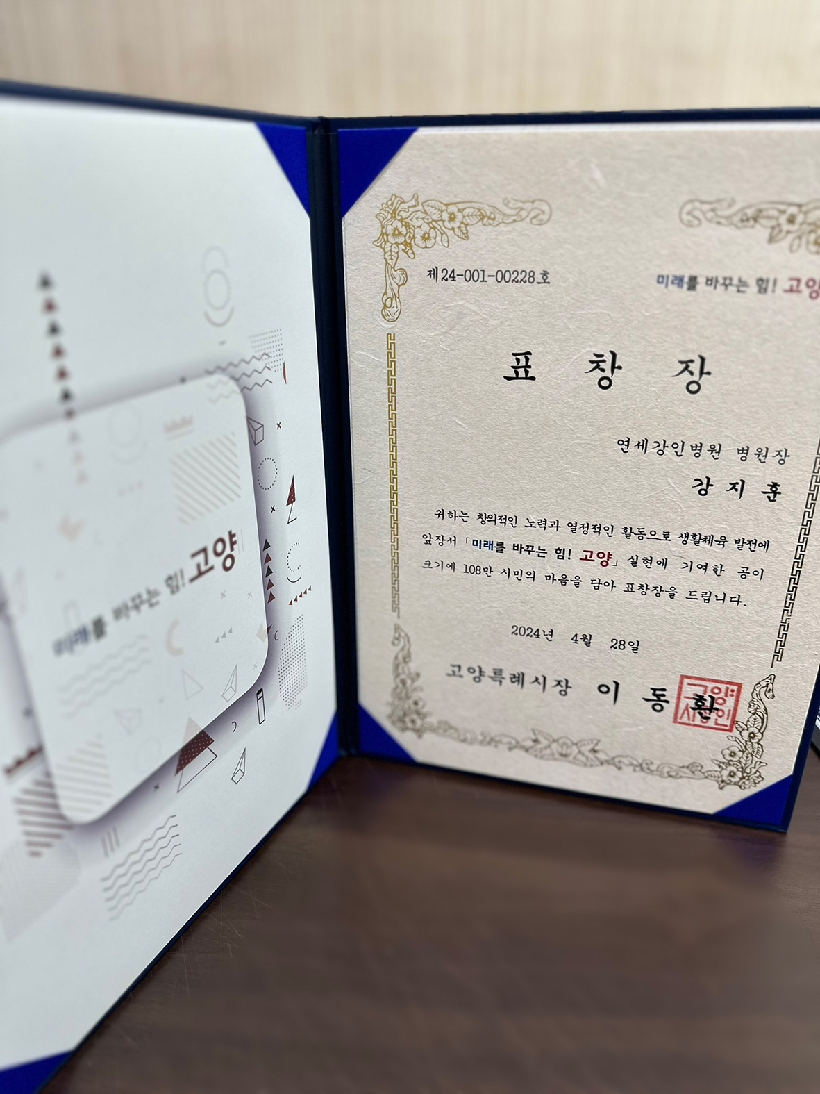 특별히 연세강인병원 강지훈 병원장님께서 지역 사회를 위해 기여하신 공을 인정 받아 고양특례시 이동환 시장님 상을 수상하셨습니다.