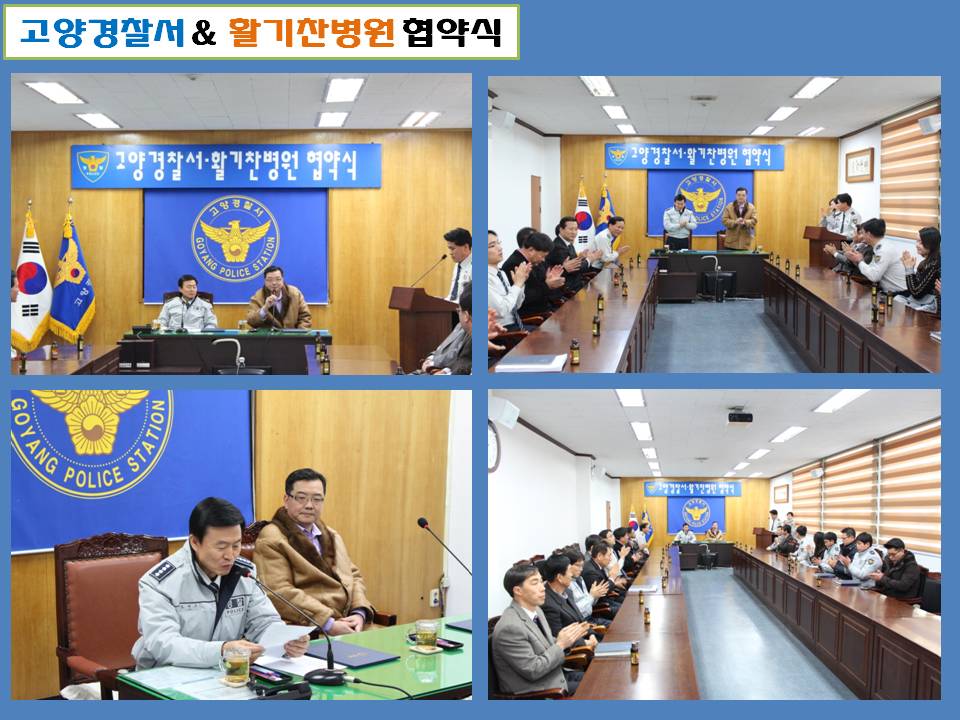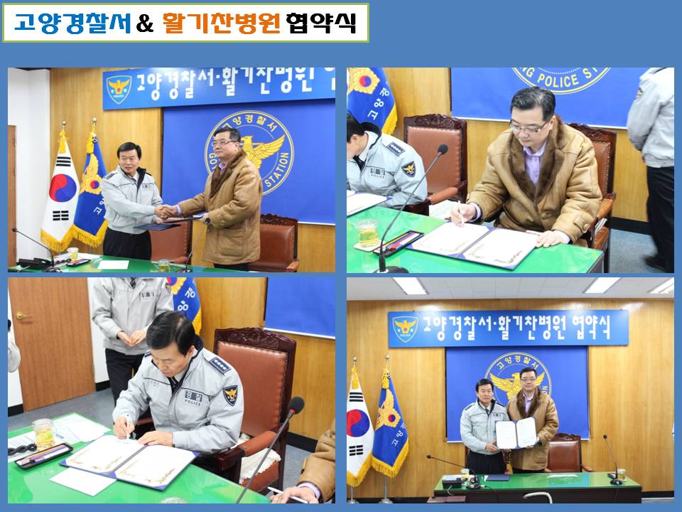 고양경찰서와 활기찬병원이 진료협약식 채결을 하였습니다. 지역주민들의 치안을 담당하고 있는 고양경찰서와 지역주민들의 건강을 책임지고 있는 활기찬병원, 양 기관은 상호 필요 시 업무진행에 있어 적극협조할 것을 약속하는 자리를 마련하였습니다. 지역의 대표적인 관절척추 전문병원으로 매김하고 있는 활기찬병원, 지역 공공기관으로 하여금 점점 그 실력을 인정받고 있는 것 같아 뿌듯합니다. 고양경찰서 서장님 이하 모든 직원분들의 관절척추 건강, 활기찬병원이 지켜드리겠습니다. 감사합니다.