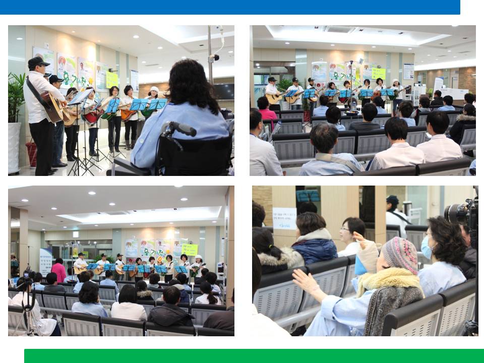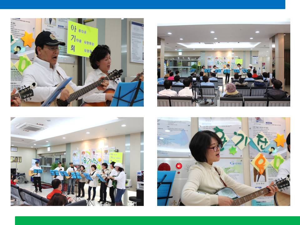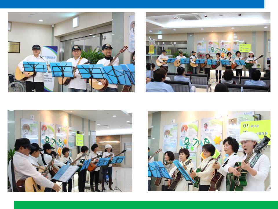 ?2월의 활기찬음악회를 도와주신 단체는 [아.기.회] 입니다. 아기회는 아름다운.기타를 사랑하는. 모임(會) 이란 뜻으로 평균연령이 63.5세의 어르신들이 모여 활동하는 통기타 동아리입니다. 입원환자들을 대상으로 작은 음악회를 열고있다는 소식을 듣고 흔쾌히 시간을 내시어 음악회를 열어주셨습니다. 오랫만에 동요를 부르면서 동심으로 돌아갈 수 있었던 시간, 음악회에 참석하신 분들이 모두 큰 웃음과 행복을 얻는 시간이었습니다.