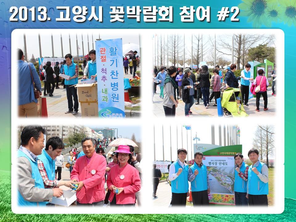 고양시 대표 척추관절 전문병원 활기찬병원이, 고양시 대표 행사인 [고양꽃박람회] 행사에 참여를 하였습니다. 전국 각지에서 오신 손님들을 대상으로 작은 기념품들을 배포하며 고양시 행사에 힘을 실어드렸습니다. 전국행사로 확대되고 있는 행사처럼, 저희 활기찬병원도 전국 각지로 소문이 나서 많은 분들이 활기찬 생활을 되찾으시는데 도움이 되는 병원으로 발전하길 소망합니다. 행사참여 : 정현기 관리이사, 이동일 원무부장, 문형민 총무과장, 김형준 총무대리 모두모두 고생하셨습니다.