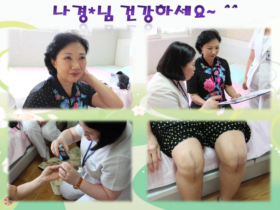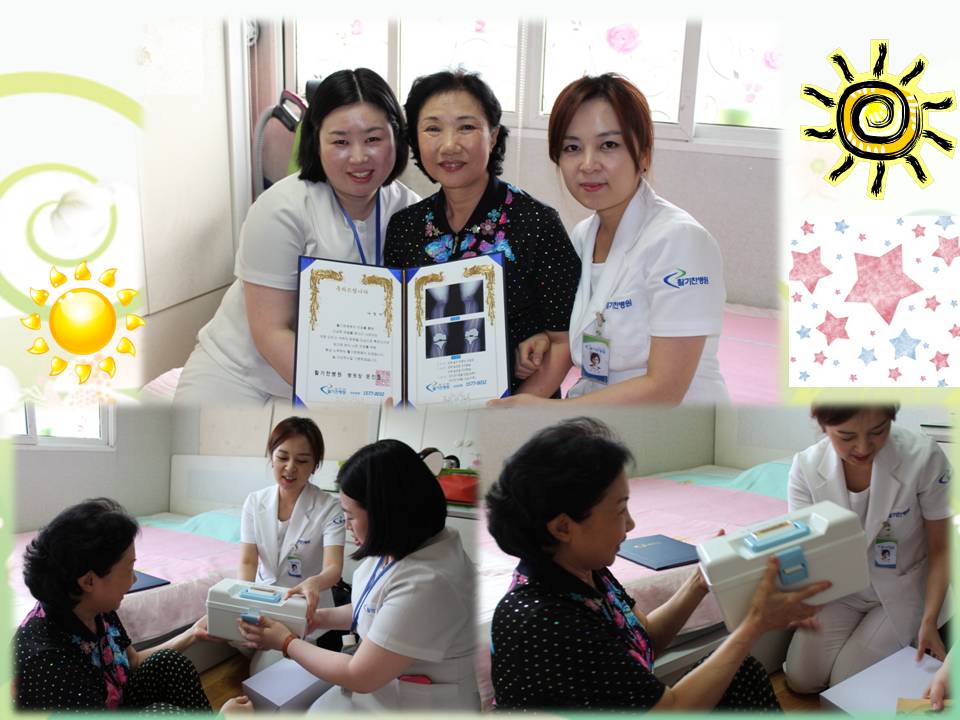 지난 6월 4일 방문간호는 우리 활기찬병원에서 인공관절수술을 받으신지 일년 가까이 된 나경자님댁이었습니다. 초등학생 4학년쯤으로 보이는 손자가 아직도 배꼽인사를 하고 있다는데 처음 놀랐고, 방문간호팀이 다녀가겠다고 하시니 풀메이크업을 하고 기다려주신 어머님께 너무 감사했습니다. 손님이 아닌데 귀한 손님처럼 시원한 음료도 주시고, 수술한지 일년이 지났는데도 이렇게 신경을 써줘서 너무나 고맙다고 몇번이고 인사를 하셨습니다. 주변에 같은 수술을 하신 분들은 걷거나 계단을 오르내릴 때 아파서 힘들어 하는 모습을 종종 보는데, 다시 수술을 하자고 할까봐 겁이나서 병원에 가는일 조차 망설이고 계신다고 하네요. 나경자 어머님께서는 ""나처럼 활기찬 병원에서 수술을 해야 후유증도 없이 쌩쌩하게 잘 다녔을텐데~""하고 원장님 자랑을 하신다네요. 너무나 감사하구요, 저희 병원에 오셔서 수술받는 분들이 모두 어머님처럼 만족하시고 건강해지시도록 늘 최선을 다하는 활기찬병원 의료진이 되겠다는 약속을 하고 돌아왔습니다. 어머니, 앞으로도 건강하세요~ ^^