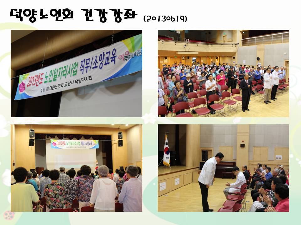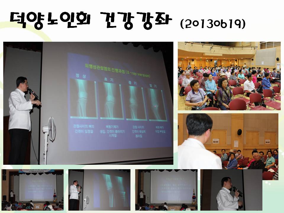 지난 6월 19일 활기찬병원 관절센터 문진웅 원장님께서 사단법인 덕양노인회 어르신들을 대상으로 건강강좌를 지원하셨습니다 진료와 수술 때문에 일정을 잡기 어려웠지만, 어르신들의 건강관리에 작으나마 도움이 되실거란 생각에 어렵게 시간을 내주셨습니다. 약 150여명의 어르신들이 퇴행성관절염에 대한 유익한 정보도 얻어가셨고, 강의를 들으신 분들가운데서는 현장에서 바로 본인 몸의 이상이라던지 주변지인들의 경우를 놓고 직접 진료상담까지 받으셨습니다. 그저 나이가 들어서 아픈줄로만 알았던 무릎통증이 왜 생기는 것인지, 어떻게 관리를 해야 건강하고 활기찬 노년을 보낼 수 있는지에 대해 알고가시는 시간이었습니다