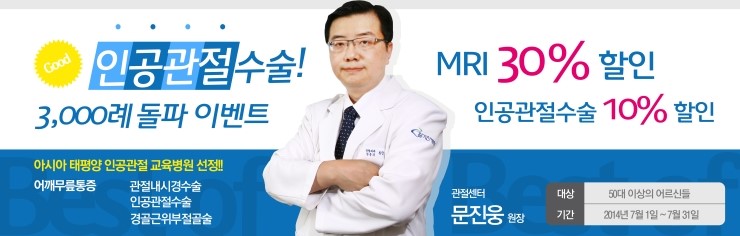 활기찬병원에서는 인공관절수술 3,000례 돌파 기념으로 7월 한달간 MRI 30%, 인공관절수술 10%의 할인이벤트를 진행합니다! 이번 이벤트는 50대 이상의 어르신들을 대상으로 그 동안 척추관절 질환이 의심되셨던 분들은 이번 이벤트를 적극 활용해보시는 것이 좋을 것 같습니다! 활기찬 병원은 세계최대 어깨 및 무릎관절경 전문 아스렉스社 지정, 아시아 지역 협력의료기관으로 인공관절 교육병원으로 선정되어 그 실력을 입증 받았습니다. 앞으로도 저희 활기찬병원이 다양한 의료혜택을 통해서 많은분들이 건강한 삶에 더 가깝게 다가갈 수 있는 기회를 만들도록 노력하겠습니다!